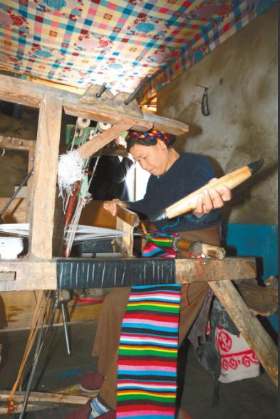 Une femme d’un ménage pauvre du canton de Zhaqi dans le comté de Zhanang profite de la saison creuse pour tisser un Pulu (le tissu en laine le plus populaire sur le plateau tibétain, pour coudre les vêtements, les bottes et les chapeaux tibétains).
