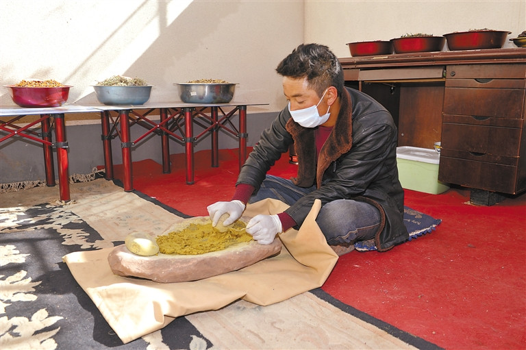 Un travailleur de la coopérative qui fabrique de l'encens tibétain.