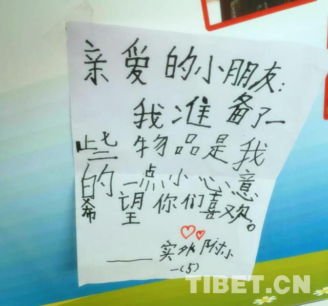 Une lettre d'un élève de l'école pilote de langues étrangères de la ville de Chengdu envoyée aux enfants du village de Naqie. On y lit : ? Chers amis, je vous ai préparé ces petits cadeaux. J'espère que ?a vous fera plaisir. Classe 5, CP, école primaire relevante de l'école pilote de langues étrangères. ?
