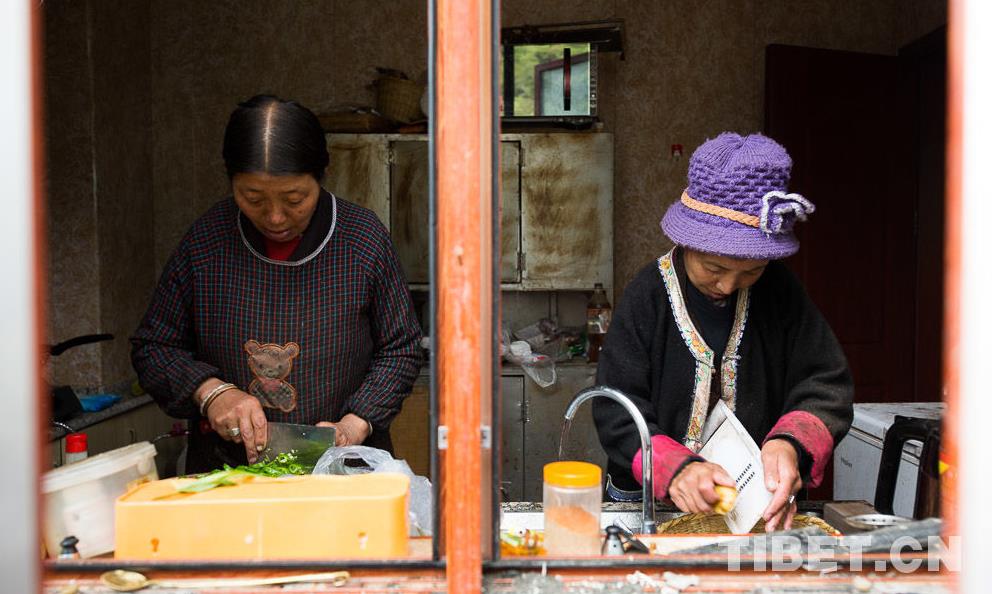 Zhuoga (à droite) et Yangzong (à gauche), toutes deux qualifiées comme des modèles de notre ère, cuisinent dans leur nouvel appartement.