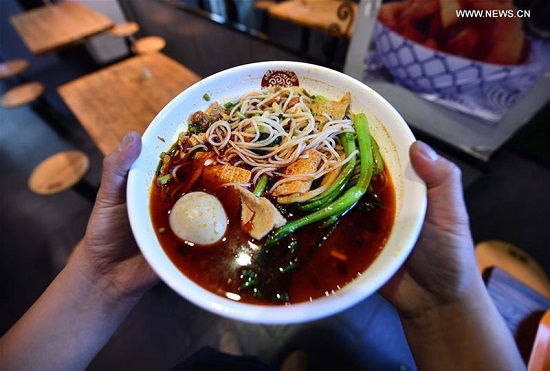 Combinant des produits alimentaires traditionnels du peuple Han et des groupes ethniques Miao et Dong, les nouilles de riz aux escargots de rivière, ou ? Luosifen ? en chinois, sont un plat de nouilles de riz bouillies avec des pousses de bambou mariné, du navet séché, des légumes frais et des arachides dans un bouillon épicé aux escargots de rivière. Cette spécialité, dont la création a été inscrite au patrimoine culturel immatériel du Guangxi en 2008, est devenue l'un des plats les plus recherchés après que le documentaire à succès ? A Bite of China ? (? Le go?t de la Chine ?) l'a mentionnée en 2012. Les nouilles de riz aux escargots de rivière offrent à la ville une nouvelle voie pour sortir de la pauvreté, car le nombre de fabricants de nouilles de riz instantanées aux escargots de rivière a augmenté en flèche et le marché en ligne s'est développé. Le gouvernement de Liuzhou a donné un coup de pouce à un ensemble d'industries liées aux nouilles de riz aux escargots de rivière. La promotion des nouilles de riz aux escargots de rivière profite aux ménages pauvres de Liuzhou car la valeur de la production de cette industrie a atteint 6 milliards de yuans (860 millions de dollars) par an.