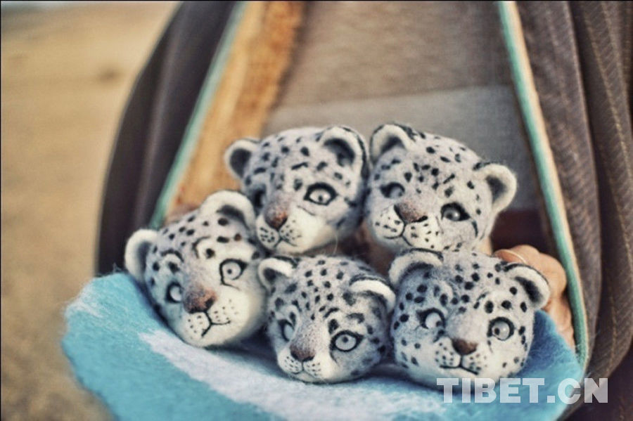 En photo : des poupées de léopard des neiges faites à la main en laine.