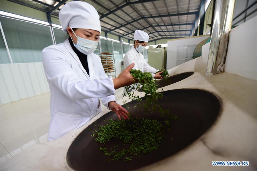 Yang Mei montre des feuilles de thé nouvellement cueillies dans un atelier de sa société de fabrication de thé du comté de Danzhai, dans la préfecture autonome Miao et Dong de Qiandongnan de la province du Guizhou (sud-ouest de la Chine), le 6 mars 2020. Yang Mei, 39 ans, est planteuse et productrice de thé dans le comté. Après avoir terminé ses études de foresterie en 2000, elle est rentrée chez elle et a appris auprès de son père Yang Guirong les techniques de plantation et de production de thé. Avec l'aide de sa famille, elle a planté un jardin de thé de 200 mu (environ 13 hectares).