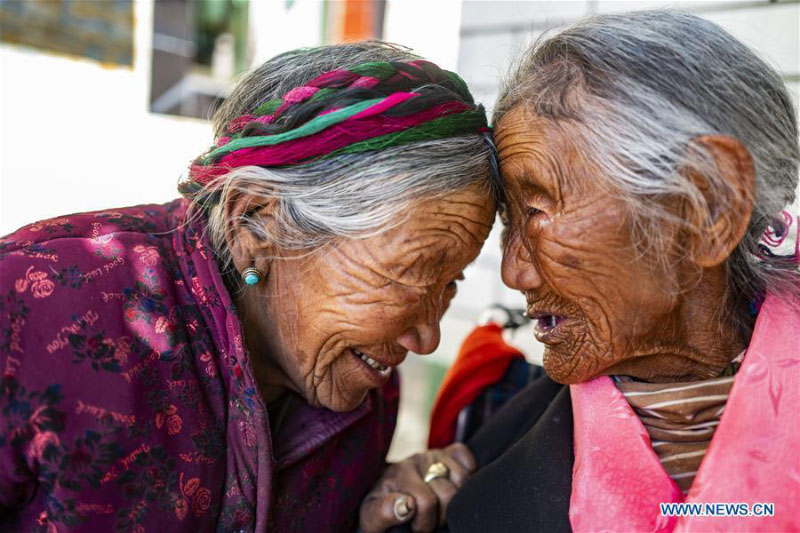 Sonam Drolma (à droite) discute avec sa s?ur dans le village de Reguo du comté de Gyaca à Shannan, dans la région autonome du Tibet (sud-ouest de la Chine), le 24 mars 2020.