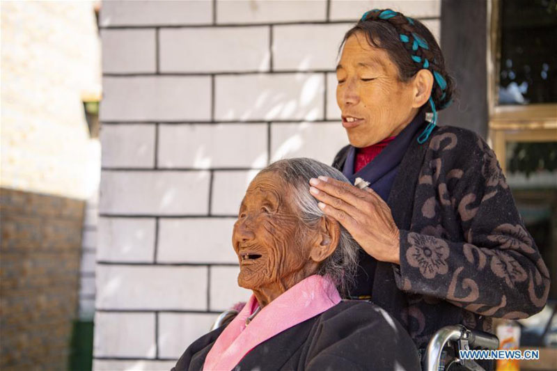 Tsering Dzongpa peigne les cheveux de sa mère Sonam Drolma (devant) dans le village de Reguo du comté de Gyaca à Shannan, dans la région autonome du Tibet (sud-ouest de la Chine), le 24 mars 2020.