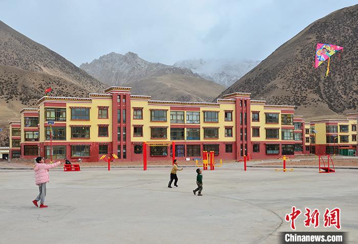 Le plateau Qinghai-Tibet est encore froid à la mi-avril. Happy Home for Herdsmen est un quartier résidentiel situé près de la source de la rivière Lancang, dans le comté de Zadoi, dans la préfecture autonome tibétaine de Yushu, dans la province du Qinghai (nord-ouest de la Chine). Sur la place, trois enfants se poursuivent et font voler des cerfs-volants. La place est entourée des batiments de trois étages de style tibétain, avec des voitures garées en bas.