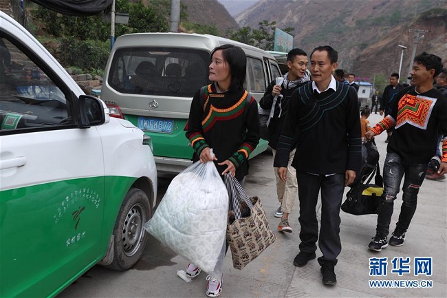 Le premier groupe d'habitants du village d'Atuleer, qui se trouve à 1400 mètres d'altitude au bord d'une falaise, dans le xian de Zhaojue de la préfecture autonome Liangshan Yi, dans la province chinoise du Sichuan, ont déménagé mardi pour leurs nouvelles maisons situées dans un quartier de réinstallation collective à Zhaojue. Grace à la politique de relocalisation pour la réduction de la pauvreté lancée par les autorités locales, 344 personnes de 84 ménages pauvres du village seront progressivement relogées du 12 au 14 mai dans leurs nouvelles maisons. (Photos : Jiang Hongjing/Xinhua)