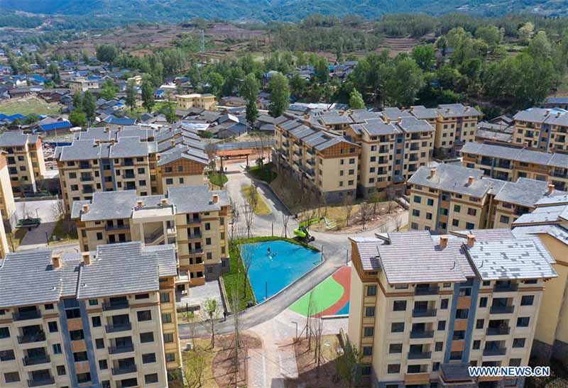 Photo aérienne prise le 13 mai 2020 montrant une communauté nouvellement construite pour la relocalisation dans le cadre de la lutte contre la pauvreté dans le comté de Zhaojue, dans la province du Sichuan (sud-ouest de la Chine).