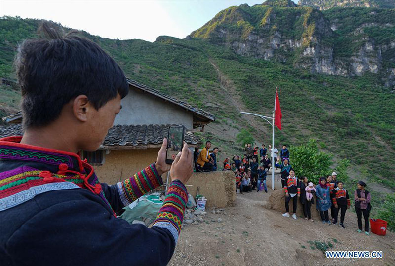 Mou'se Laji diffusant en direct une réunion entre les villageois d'Atulieer sur le déplacement vers un site de réinstallation dans le comté de Zhaojue, dans la province du Sichuan (sud-ouest de la Chine), le 10 mai 2020.