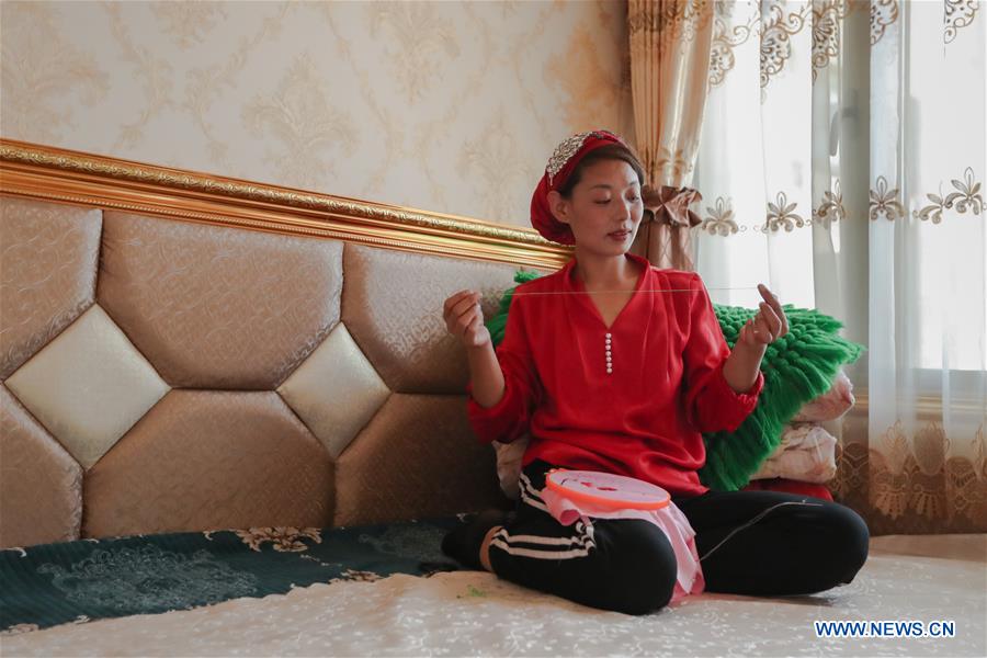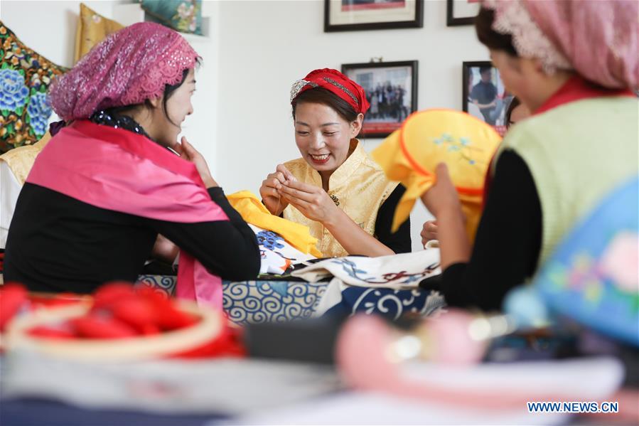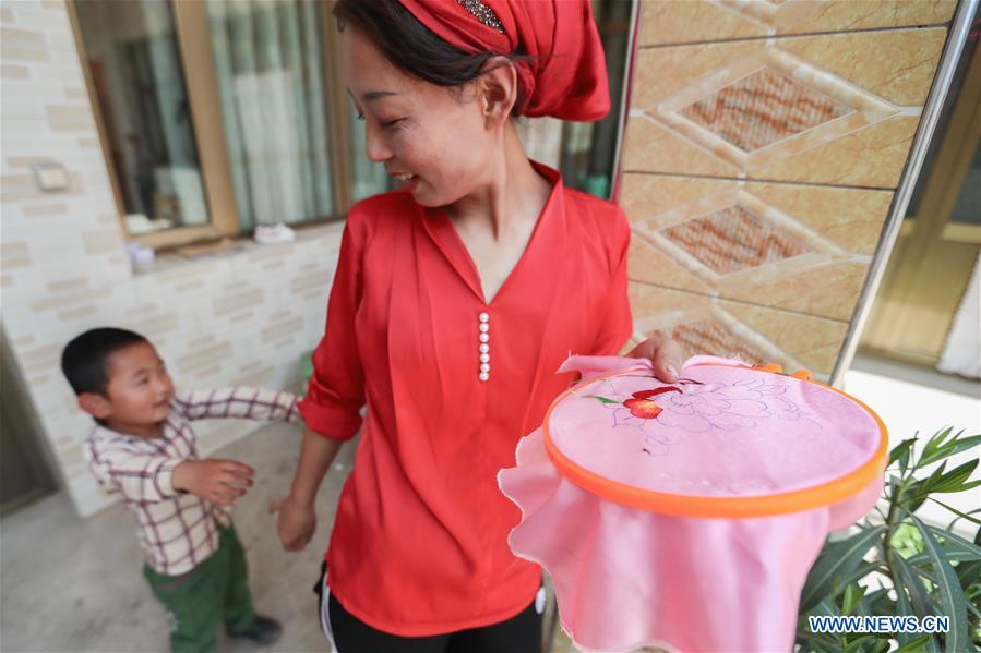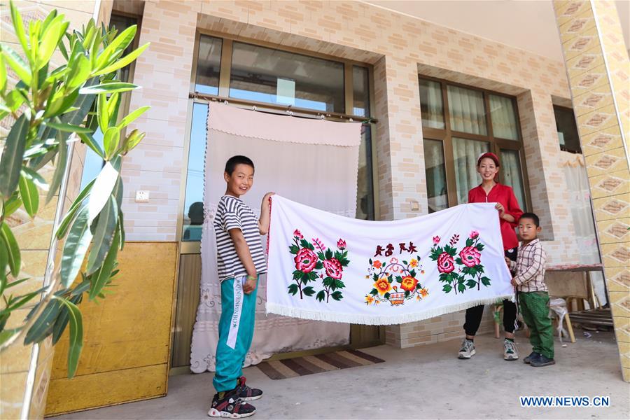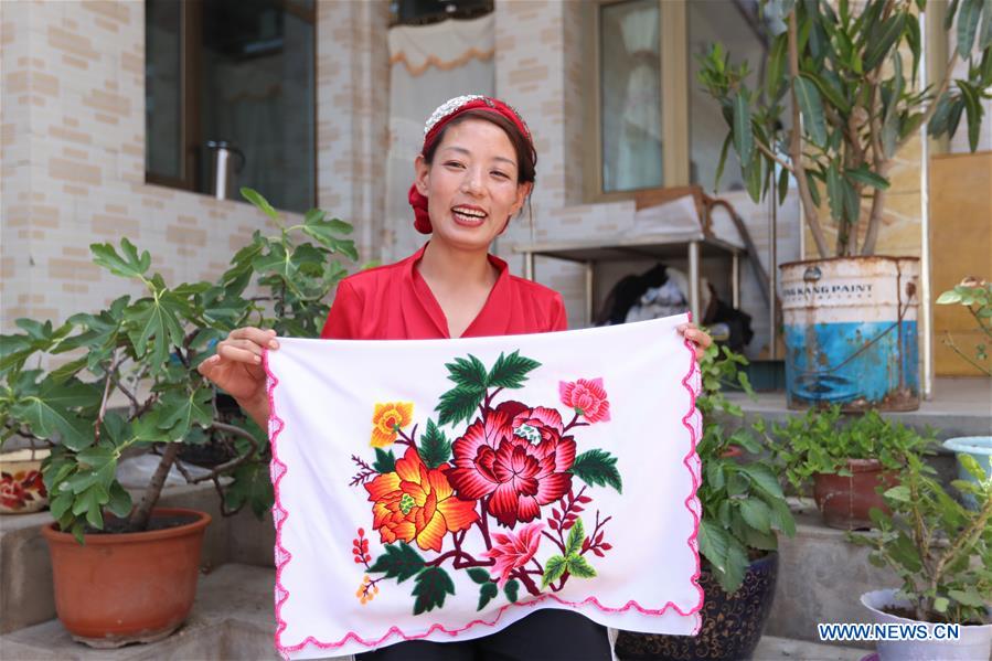 Ma Semai montre une de ses broderies réalisées il y a 18 ans, à son domicilede la ville de Daban, dans le comté autonome Dongxiang de la préfecture autonome Hui de Linxia, dans la province du Gansu (nord-ouest de la Chine), le 30 mai 2020. Ma Semai, agée de 36 ans et de l'ethnie Dongxiang, est l'une des brodeuses qui travaillent dans un atelier de broderie traditionnelle créé par le gouvernement local comme approche de la lutte contre la pauvreté. L'atelier emploie plus de 80 femmes locales de l'ethnie Dongxiang qui sont douées pour la broderie, et a également attiré près de 200 villageoises, qui terminent ses commandes chez elles.
