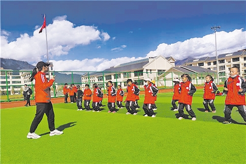 En photo : sur le terrain d'exercices de l'école primaire Tuanjie dans le district de Bayi, ville de Nyingchi, au Tibet, une institutrice en programme d'aide au Tibet du Guangdong enseigne le taekwondo aux élèves.