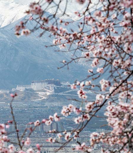 Vue du palais du Potala à travers des fleurs de pêcher à Lhassa, dans la région autonome du Tibet, dans le sud-ouest de la Chine, le 7 avril 2020. (Photo : Sun Fei)