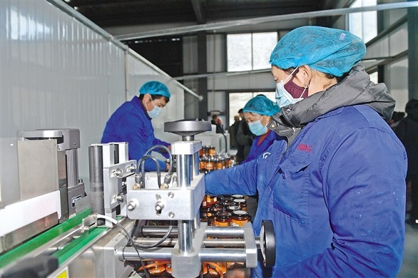 Des travailleurs de la société Jinlang Food Co., Ltd. en train d'emballer la sauce chili dans le canton de Zhomda, dans le district de Nang de la ville de Nyingchi.