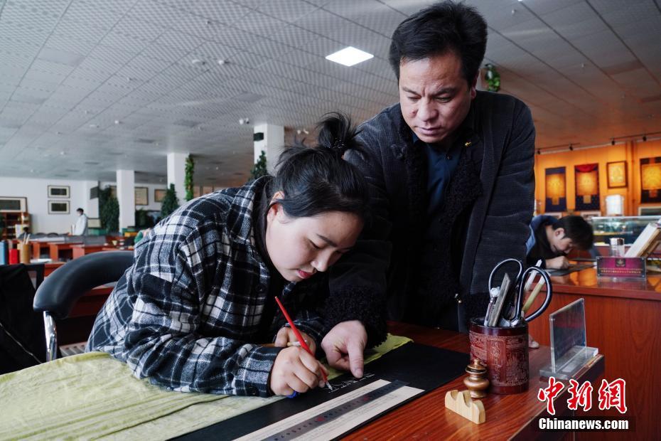 Le 18 janvier, Tsering Dorje (à droite), le responsable du Centre de transmission et d'études complètes du patrimoine culturel immatériel du district de Jainca, dans la préfecture autonome tibétaine de Huangnan, province du Qinghai, explique le format des écritures bouddhistes tibétaines aux étudiants.