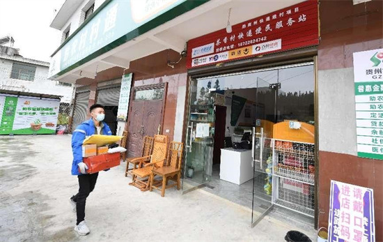 Le 11 novembre 2021, un livreur dépose des colis express à la station de services aux villageois dans le village de Chaxiang du bourg de Gujiao du comté de Longli de la province du Guizhou (dans le sud-ouest de la Chine). (Deng Gang / Pic.people.com.cn)