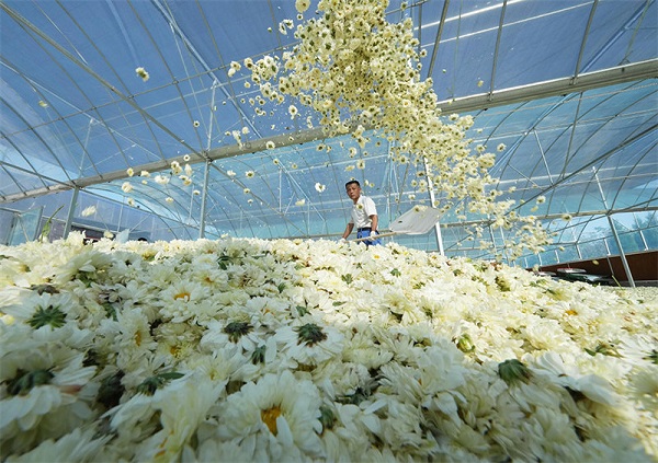 Des plantes médicinales chinoises de chrysanthème blanc de Taihang sont entrées dans la saison de la récolte dans le canton de Jiazhuang de l'arrondissement de la zone minière de Jingxing à Shijiazhuang, capitale de la province du Hebei (nord de la Chine). (Photo / Xinhua)