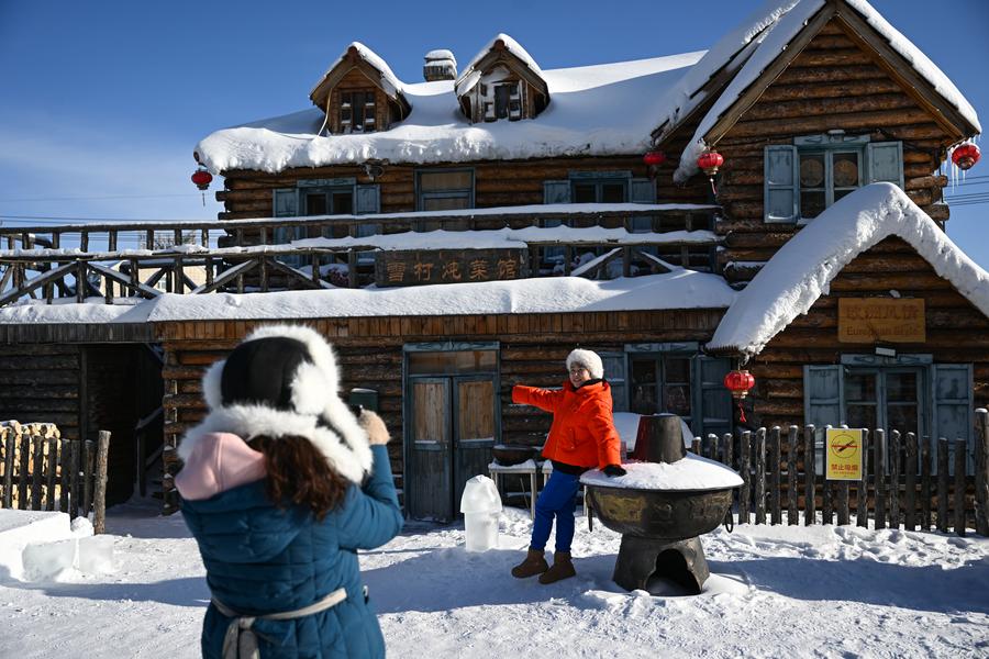 Des touristes prennent des photos à Arxan de la Ligue de Hinggan, dans la région autonome de Mongolie intérieure (nord de la Chine), le 14 décembre 2023. (Photo : Bei He)
