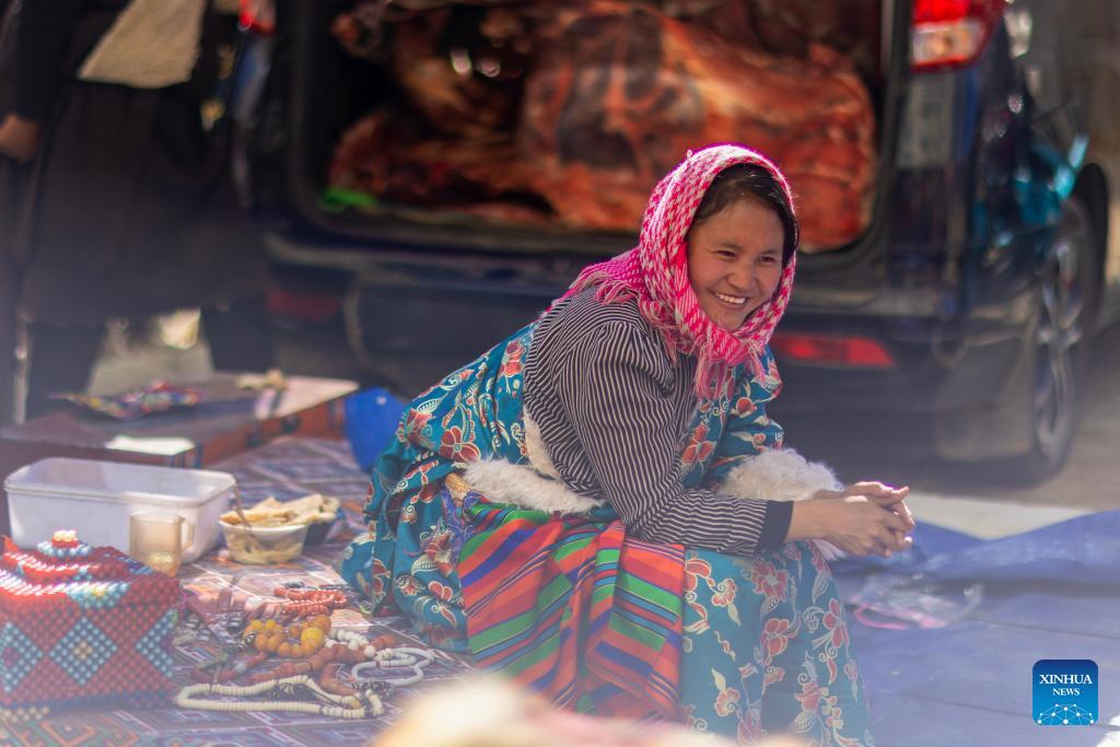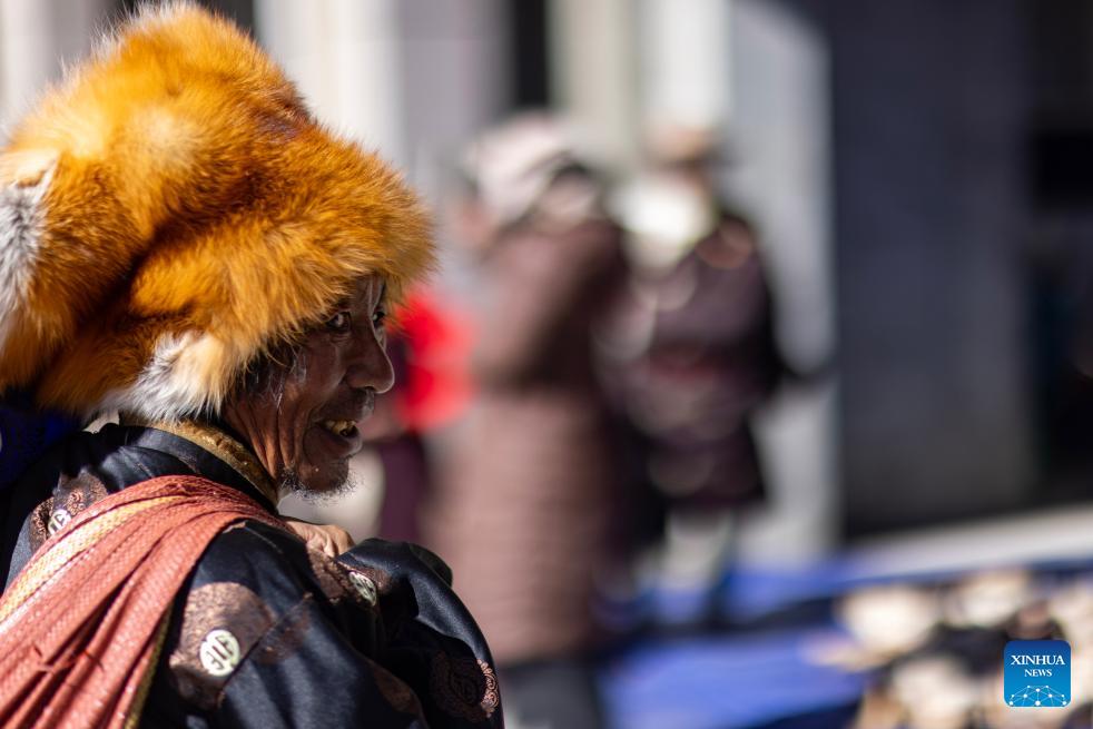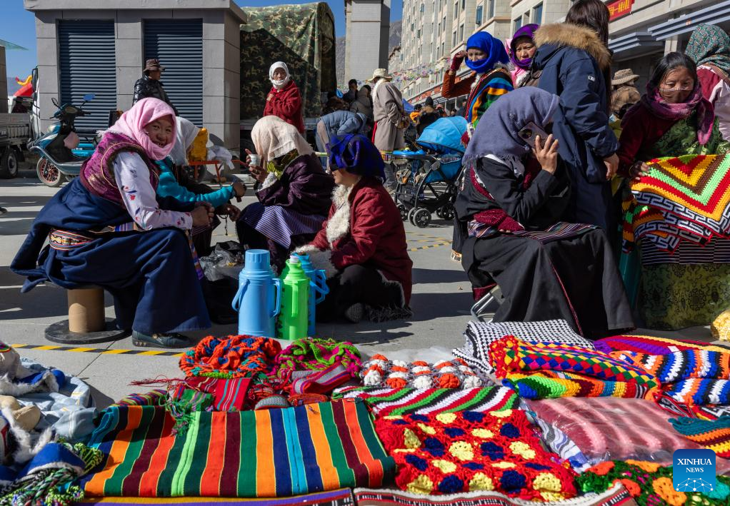 Des habitants locaux vendent des produits faits à la main lors d'une foire commerciale organisée sur le site de relocalisation de Singpori à Shannan, dans la région autonome du Xizang (sud-ouest de la Chine), le 17 décembre 2024. Une foire commerciale de six jours a débuté mardi sur le site de relocalisation de Singpori, qui abrite plus de 30 000 résidents délocalisés. Singpori se trouve sur la rive nord de la rivière Yarlung Zangbo dans la ville de Shannan, à une altitude de 3 600 mètres.