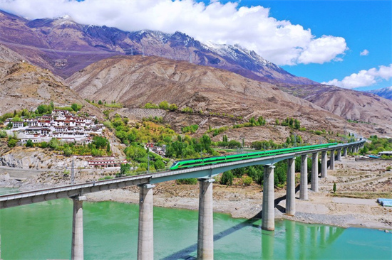 Un train Fuxing roulant sur la ligne de chemin de fer Lhassa-Nyingchi dans le district de Nang, dans la région autonome du Tibet, dans le sud-ouest de la Chine, le 14 avril 2022. (Xinhua/Chogo)