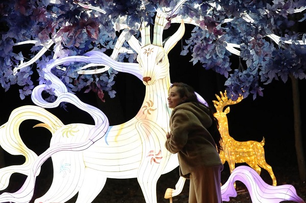 Une femme pose pour des photos avec des lanternes lors du Festival Dragons et Lanternes au Jardin d'Acclimatation à Paris, en France, le 14 décembre 2023. (Xinhua/Gao Jing)