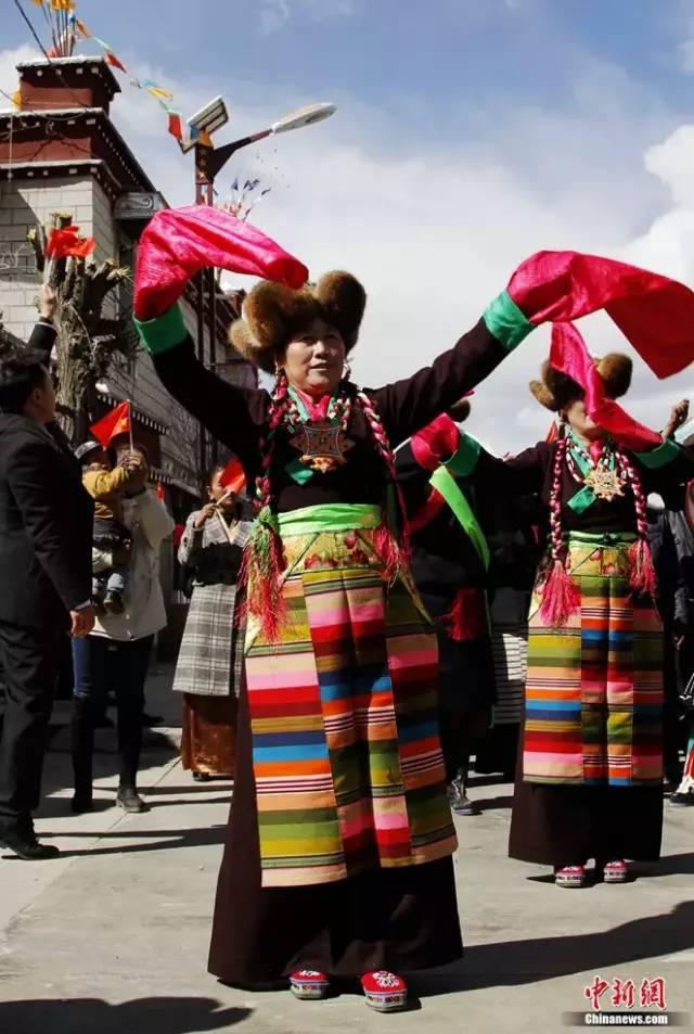 Dans le monastère de Jokhang, les femmes de Lhassa, vêtues de leur costume traditionnel, célèbrent la Fête Bailamu, aussi connue sous le nom de ? Fête des fées ? ou et ? Fête des femmes ?.