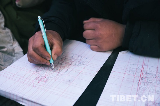 En photo : Qu Zha étant en train de dessiner un Thangka, une bo?te de pigment en conque dans la main gauche.