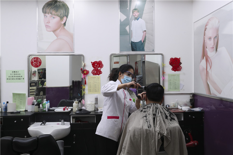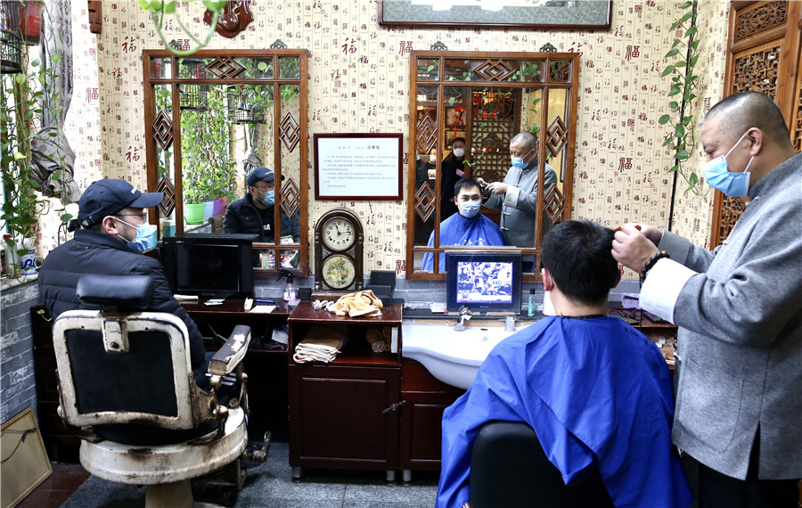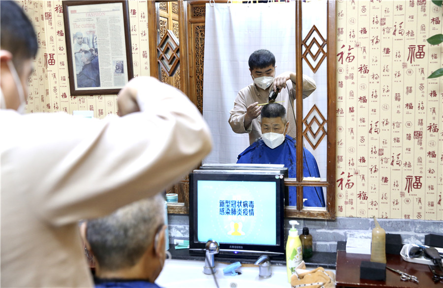 Un homme se fait couper les cheveux dans un salon de coiffure de Beijing, le 24 février 2020, journée qui marque la fête Longtaitou, ou fête du Dragon qui relève la tête. De nombreux Chinois croient qu'une nouvelle coiffure ce jour-là leur portera chance. Les barbiers et les salons de coiffure de la ville ont toutefois limité le nombre de clients et contr?lé la température de chaque personne pour assurer un environnement s?r au milieu de l'épidémie en cours.