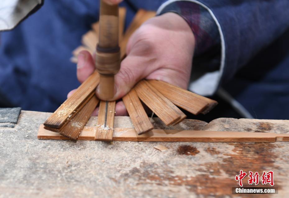 Photo prise le 19 mars, montrant un ouvrier arrangeant des montures d'éventail en bambou traditionnel chinois dans un atelier de produits artistiques à Anji, dans la province du Zhejiang (est). Ces éventails ont été choisis parmi les objets souvenirs commandés pour les Jeux olympiques de Tokyo 2020.