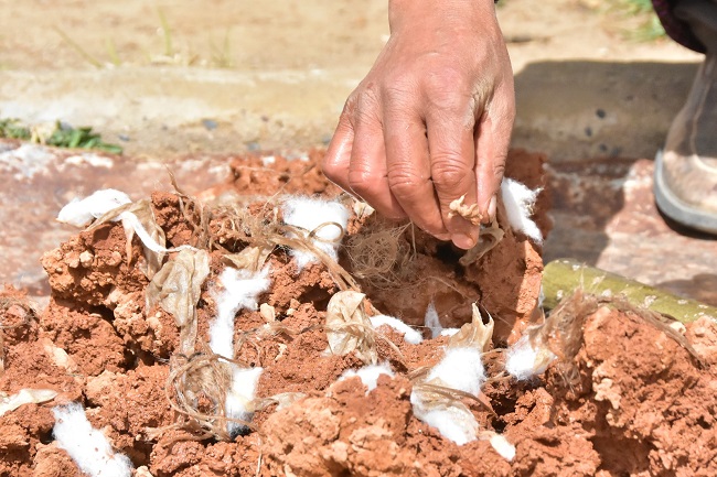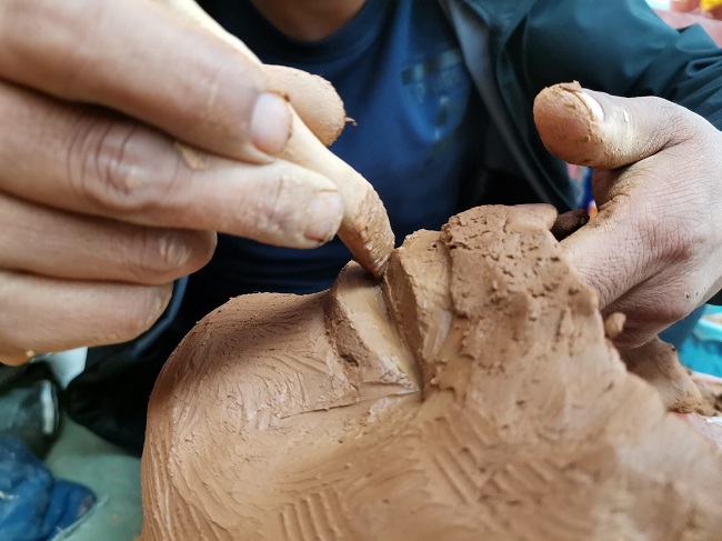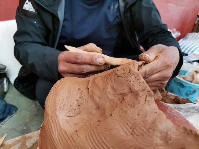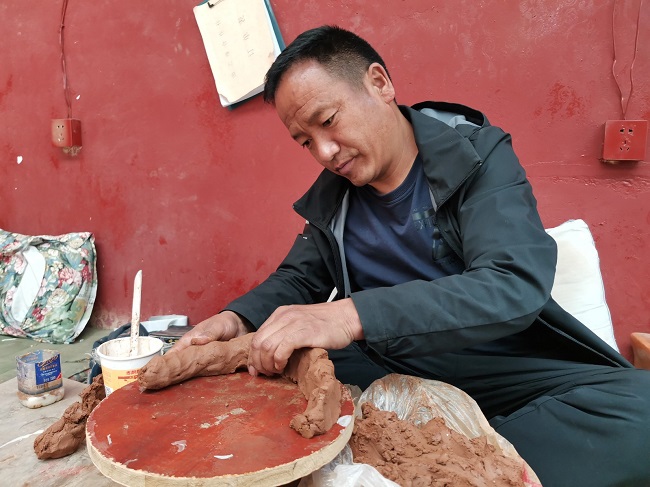Cependant, cette argile rouge nécessite un traitement spécial avant de pouvoir être vraiment utilisée dans la modélisation de l'argile. Il faut d'abord briser les morceaux de l'argile et la mélanger avec de l'eau. Entre temps, on y ajoute du coton, de la corde de paille et du papier tibétain. On mélange encore durement, et le résultat est satisfaisant uniquement lorsque tous les matériaux sont mélangés uniformément.