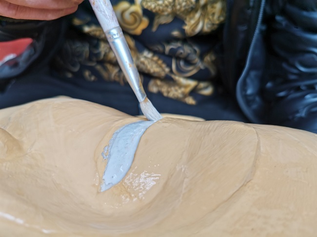 ? Toute l'argile que nous avons utilisée était transportée du district de Lhundrup, et de nulle part ailleurs. On a fait des essais avec de la terre noire, mais l'effet n'est pas très satisfaisant ?, dit Shilok. L'argile de Lhundrup, qui est délicate, sans sable et collante, est devenue la matière première la plus importante pour la sculpture d'argile traditionnelle.