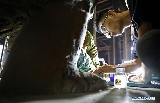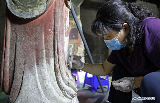 Un expert en conservation des reliques restaure une sculpture en argile peinte en couleurs au monastère de Fengguo, situé dans le comté de Yixian à Jinzhou, dans la province du Liaoning (nord-est de la Chine), le 8 juin 2020. Construit en 1020, le monastère de Fengguo abrite une rare collection de sculptures bouddhistes en argile peintes en couleurs. En 2012, le ? hall principal du monastère de Fengguo ? a été soumis par la Chine pour inscription aux listes indicatives du patrimoine mondial de l'UNESCO. (Yao Jianfeng / Xinhua)
