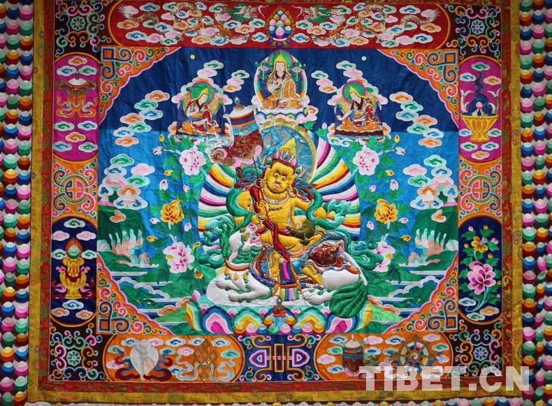 En photo : un Thangka brodé avec le Dieu de la richesse.
