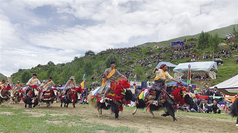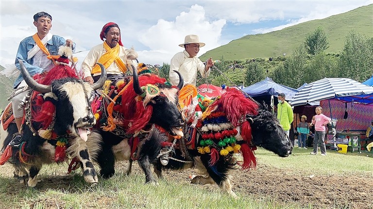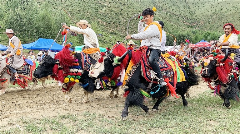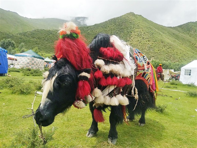 Ce festival culturel et artistique propose des spectacles équestres traditionnels et des courses de yaks. Par rapport au spectacle équestre, l'ambiance de la course de yak est plus active. Les spectateurs rient et s'exclament constamment. De temps en temps, les gens discutent et rient des yaks décorés de fa?on exagérée sur la piste de course. Dès que le premier yak apparait, avec ses coiffures exagérées, ses longs poils, ses rubans aux cinq couleurs attachés à sa queue et ses cornes polies, l'atmosphère des spectateurs est poussée à son paroxysme.