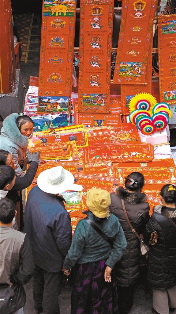 En marchant dans le centre commercial animé de Barkhor, des bo?tes qiema, des épis de blé colorés, des sculptures en beurre délicates et d'autres produits du Nouvel An remplissent les boutiques.