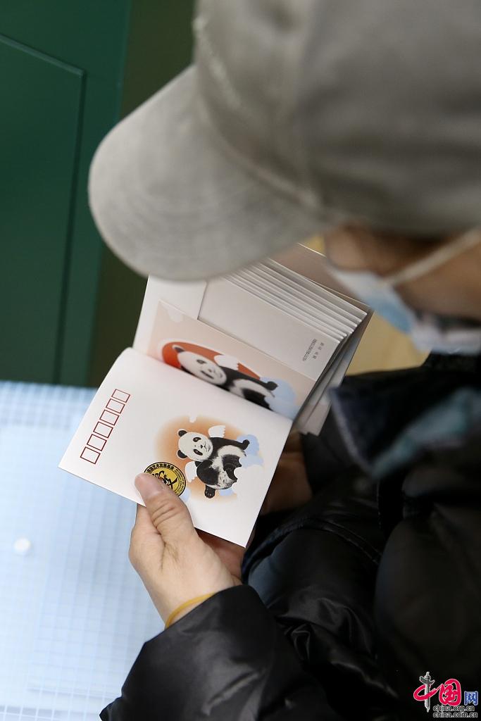 Un client montre une série de cartes sur le thème du panda dans un bureau de poste situé au centre commercial Guomao, à Bejing, le 22 mars 2021. Une bo?te postale originale et un cachet de la poste sur le thème du panda ont été récemment mis en service à Beijing. (Photos : Yi Haifei/VCG)