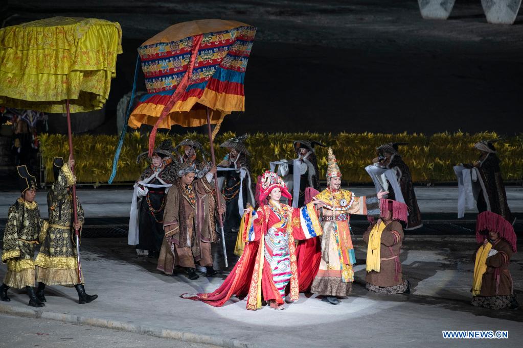Des artistes interprètent l'opéra "La princesse Wencheng" à Lhassa, capitale de la région autonome du Tibet (sud-ouest de la Chine), le 10 avril 2021. Un opéra en plein air basé sur la vie d'une princesse de la dynastie Tang (618-907 apr. J.-C.) a été mis en scène dans la ville samedi. (Photo : Sun Ruibo)