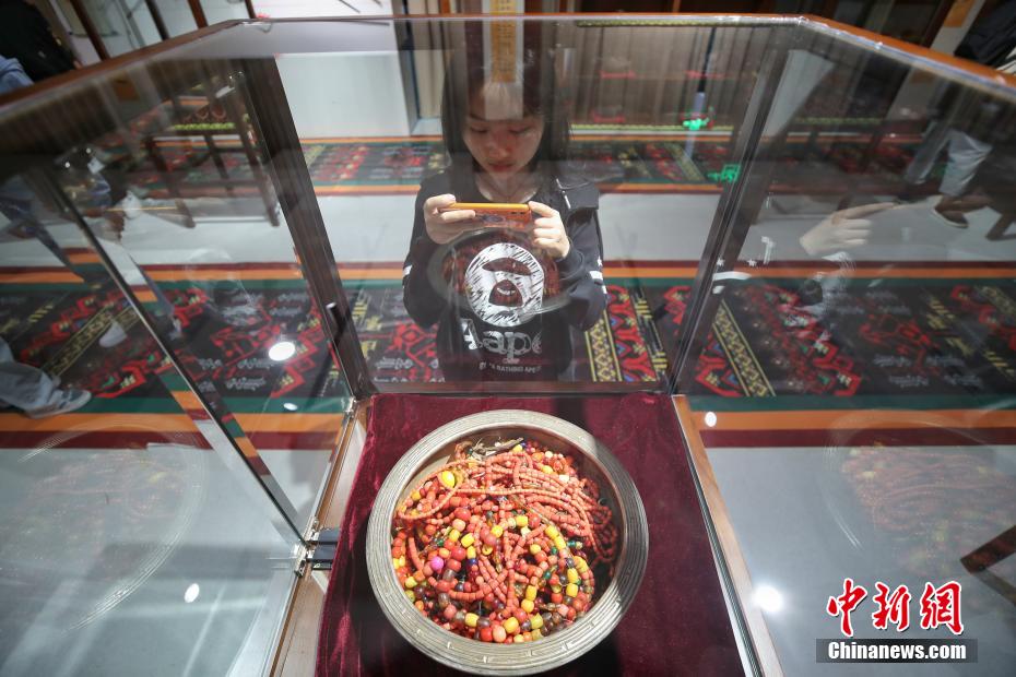 Une étudiante admire une ?uvre en bronze lors d'une exposition d'antiquités de l'ethnie Yi à l'Université Minzu du Guizhou, dans la Nouvelle Zone de Gui'an, le 17 mai 2021. L'exposition présente au public l'histoire, la culture et les arts folkloriques de l'ethnie Yi à travers plus d'un millier d’objets précieux.