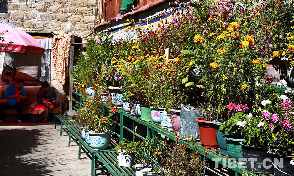 La rue Barkhor devant la porte est animée,mais la vie dans la cour est calme et paisible. En entrant dans l'enceinte des résidents de Gongsangzi dans la vieille ville de la rue Barkhor à Lhassa, le soleil brille dans la cour et les fleurs sont en pleine floraison. Une grand-mère travaille avec ses aiguilles et les enfants jouent joyeusement. Il y a des dizaines de familles tibétaines, han, hui et d'autres groupes ethniques qui vivent dans l'enceinte, et les voisins forment comme une famille.