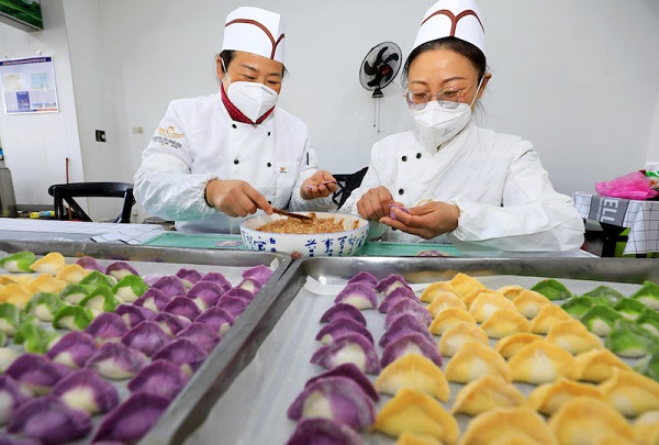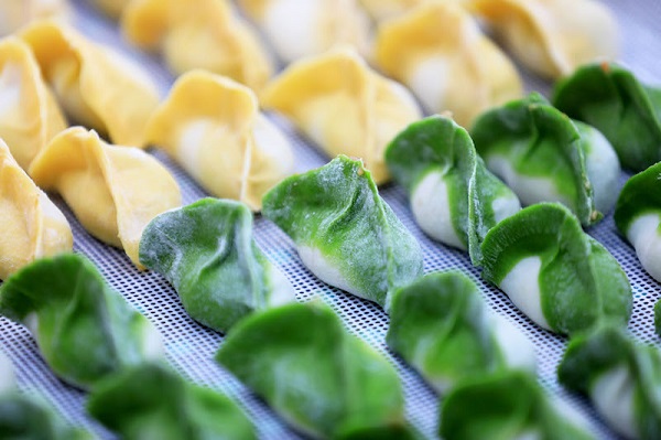 Lors du ? Solstice d'hiver ?, il y a en Chine une coutume qui consiste à manger des raviolis. Les employés d'une industrie de transformation alimentaire de la ville de Huaibei, dans la province de l'Anhui (est de la Chine), mélangent respectivement le jus de chou, de citrouille, d'épinards et de carottes à de la farine pour faire des feuilles de raviolis colorées, qui sont populaires chez les habitants locaux.