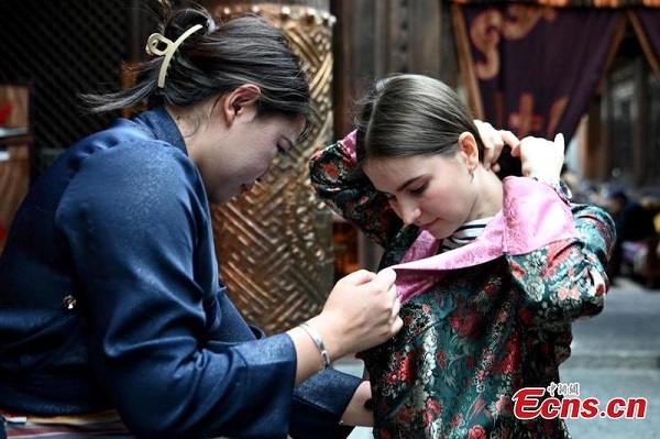 Un membre du personnel aide une jeune femme à essayer des vêtements tibétains lors d'un événement organisé dans la vieille ville de Dukezong, dans le comté de Shangri-la dans la province du Yunnan (sud-ouest de la Chine), le 26 juin 2023. (Li Jiaxian / China News Service)