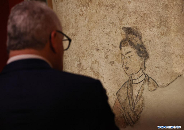 Un visiteur regarde une peinture lors de l'exposition intitulée "La Chine des Tang -- Une dynastie cosmopolite (VIIe-Xe siècle)" au Musée national des arts asiatiques Guimet en France, le 18 novembre 2024. (Xinhua/Gao Jing)