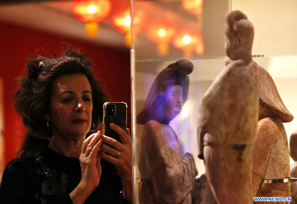Une visiteuse prend des photos des objets exposés lors de l'exposition intitulée "La Chine des Tang -- Une dynastie cosmopolite (VIIe-Xe siècle)" au Musée national des arts asiatiques Guimet en France, le 18 novembre 2024. (Xinhua/Gao Jing)
