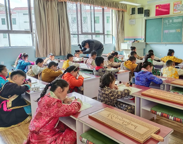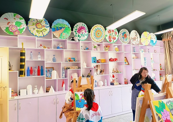 Chaque salle de classe est aménagée avec beaucoup de soin et de chaleur. Les murs sont décorés de fresques aux motifs culturels ethniques, et les bureaux sont bien rangés, avec des livres et des fournitures scolaires à leur place. Les élèves suivent des cours diversifiés : dessin, artisanat, langue tibétaine, etc. La variété des cours enrichit non seulement les contenus d'apprentissage, mais stimule également la créativité et les compétences pratiques des élèves.