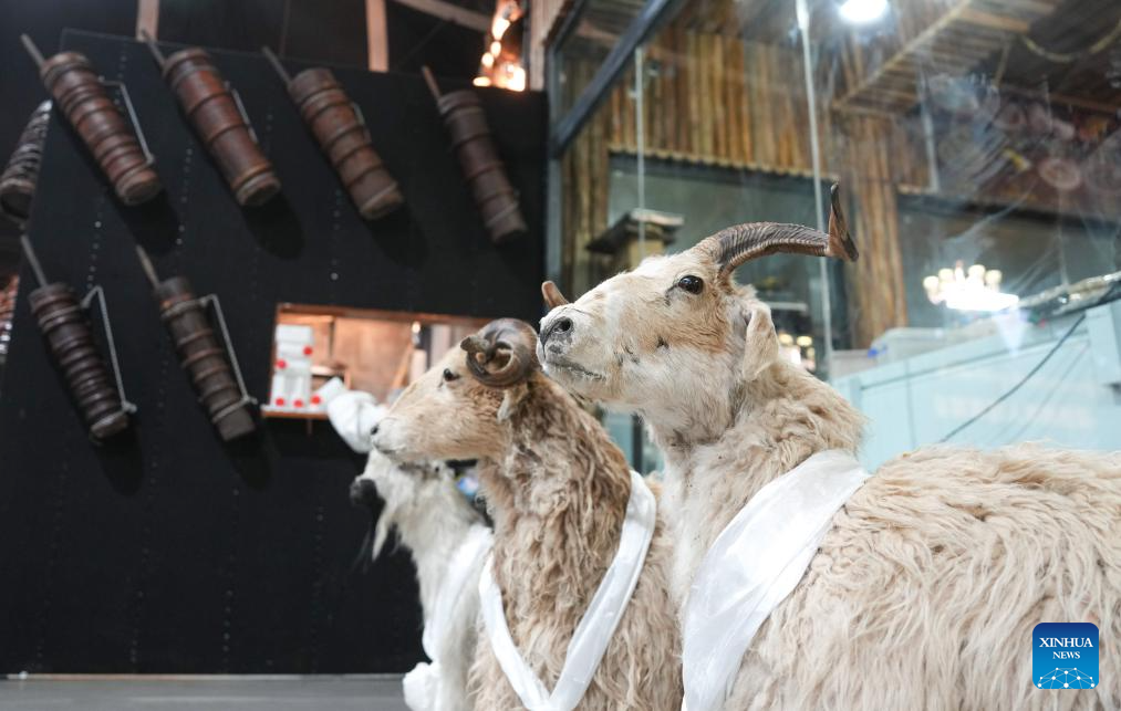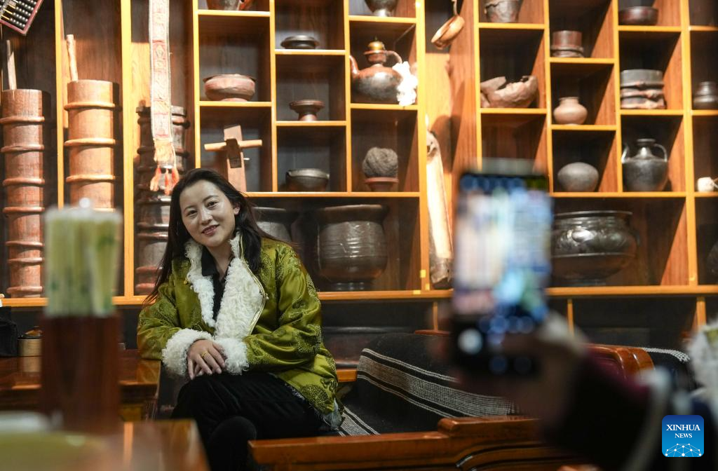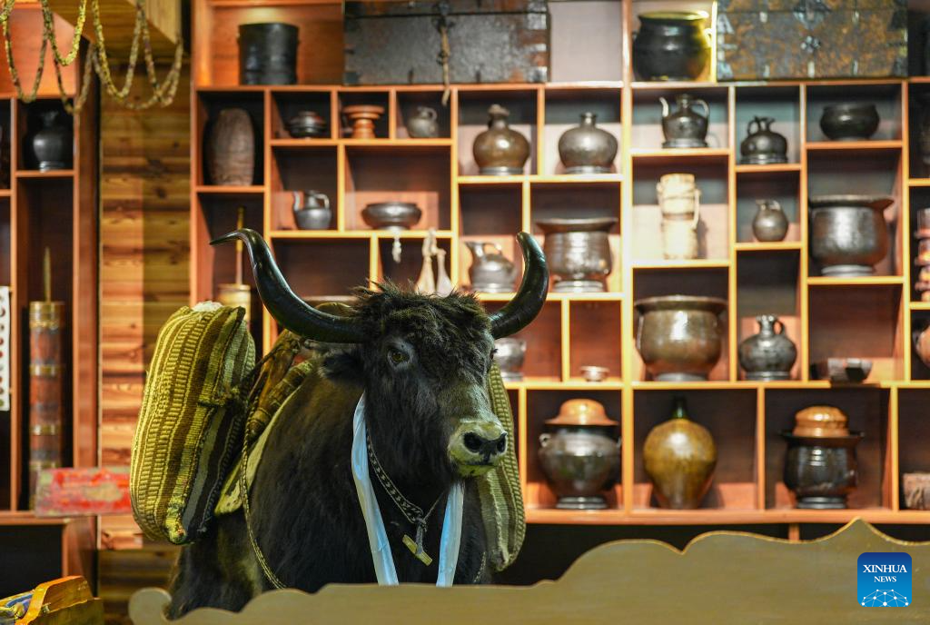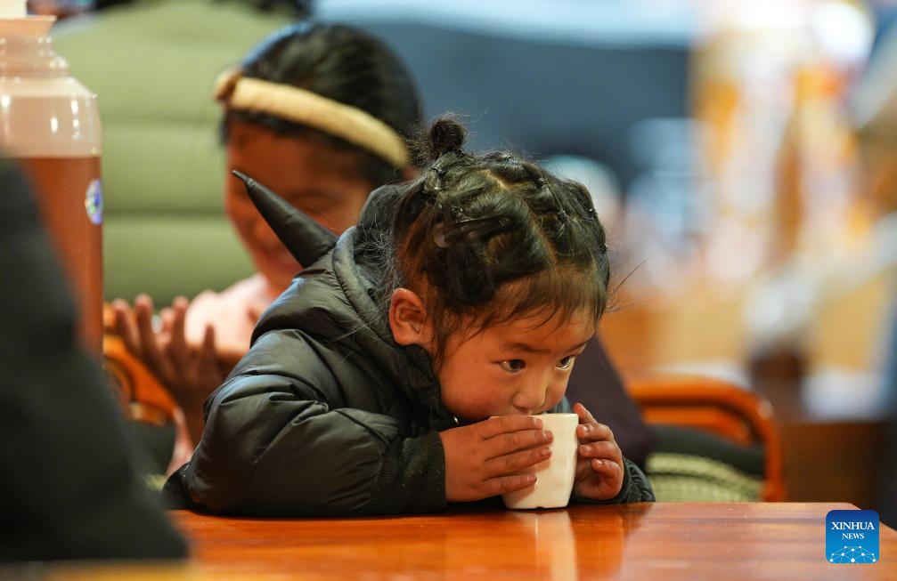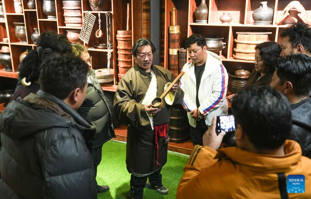 Photo prise le 13 février 2025 montrant un salon de thé de style tibétain dans le district de Seni à Nagqu, dans la région autonome du Xizang (sud-ouest de la Chine). S'étendant sur une surface d'environ 1 200 mètres carrés, le salon de thé de style tibétain offre aux clients à la fois des spécialités tibétaines et des expériences immersives dans la culture folklorique locale. Présentant en outre plus de 3 000 objets traditionnels tibétains, le salon de thé offre un aper?u de la vie nomade dans le nord du Xizang. (Jigme Dorje / Xinhua)
