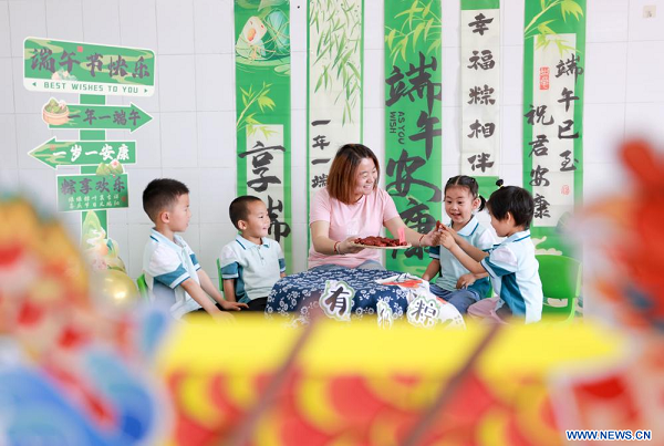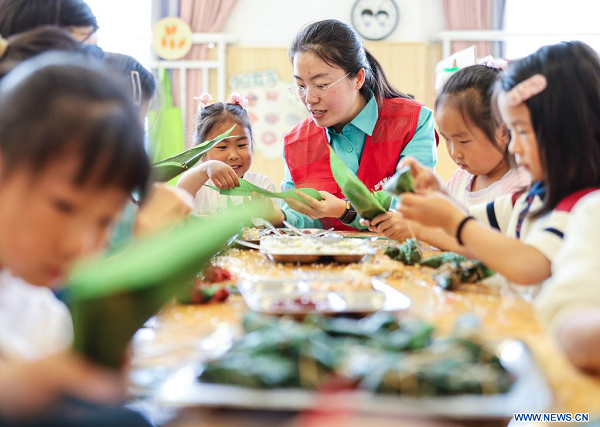 Une bénévole prépare le zongzi, un gateau de forme pyramidale composé de riz gluant et emballé dans des feuilles de bambou ou de roseau, avec des enfants dans une maternelle de la ville de Rongcheng, dans la province chinoise du Shandong (est), le 28 mai 2025. La Fête des bateaux-dragons, également connue sous le nom de Fête Duanwu, tombe le cinquième jour du cinquième mois du calendrier lunaire chinois. Cette année, elle sera célébrée le 31 mai. (Photo : Li Xinjun)