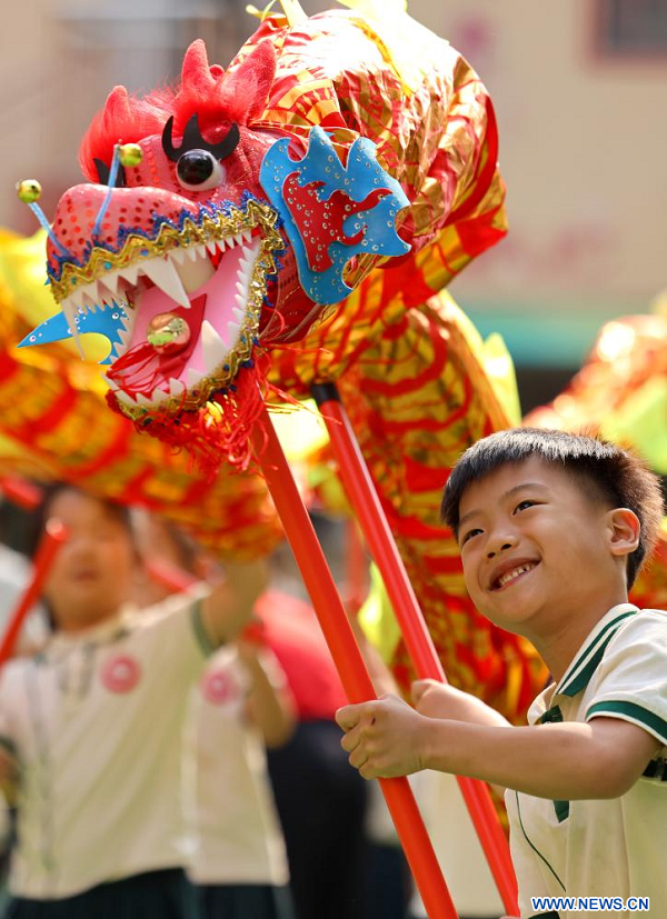 Des enfants participent à une danse du dragon dans une maternelle de la ville de Zaozhuang, dans la province chinoise du Shandong (est), le 27 mai 2025. La Fête des bateaux-dragons, également connue sous le nom de Fête Duanwu, tombe le cinquième jour du cinquième mois du calendrier lunaire chinois. Cette année, elle sera célébrée le 31 mai. (Photo : Sun Zhongzhe)