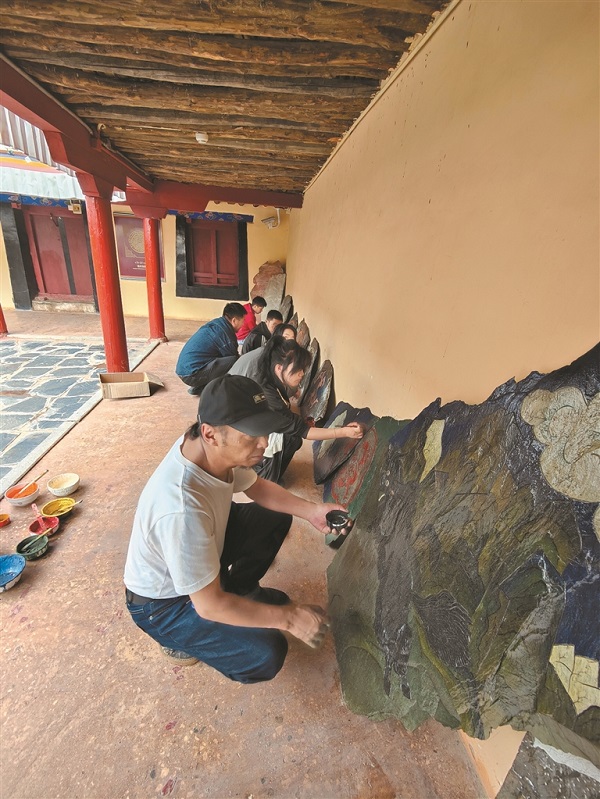 De l'estrade au chevalet, de la salle de classe aux chantiers de restauration des anciens édifices, Gyatso, artiste de premier rang, retrace du bout des doigts le fil millénaire de la peinture décorative tibétaine ; depuis deux décennies, il se consacre sans relache à l'éducation professionnelle, y semant la culture et perpétuant la flamme de la tradition. Tel un ? dougong ?, ces embo?tements sculptés qui soutiennent silencieusement l'architecture tibétaine, il ?uvre dans la discrétion mais porte solidement la transmission de l'art pictural tibétain, la continuité de ce patrimoine culturel, et l'engouement de la jeune génération pour renouer avec les savoir-faire ancestraux.