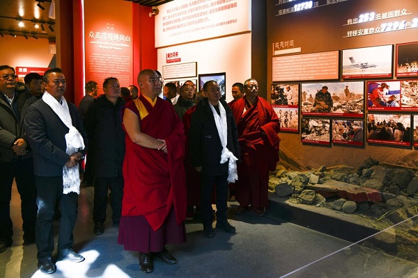 Le panchen Rinpoche inspectant la reconstruction post-catastrophe au musée de l'histoire du village de Senga, l'un des villages les plus durement touchés par le séisme de magnitude 6,8 qui avait touché le comté de Dingri