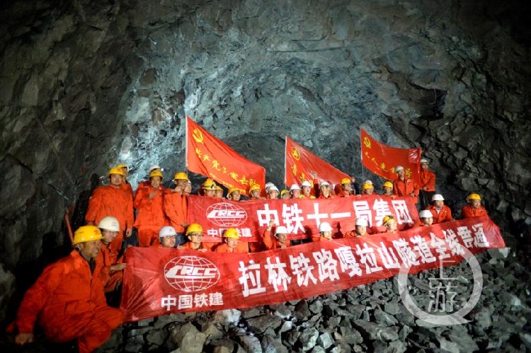 La photo montre le tunnel de la montagne Gala de la section Lhassa-Nyingchi du chemin de fer Sichuan-Tibet. Tous les employés ont pris une photo de groupe dans le tunnel.