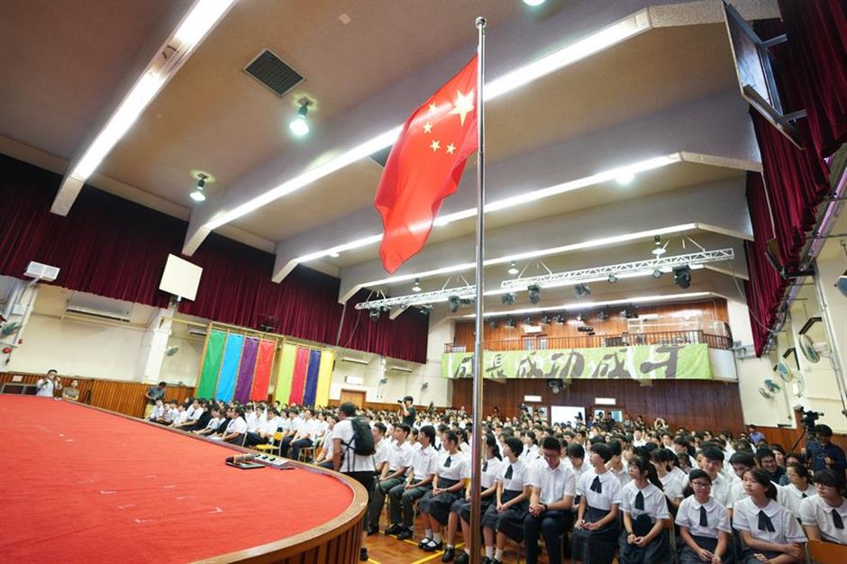 Lundi 2 septembre, 800 élèves et enseignants étaient rassemblés pour une cérémonie de lever du drapeau national dans une grande salle de l'école Wong Cho Bau, dans les Nouveaux Territoires. Cette cérémonie est une tradition dans cette école lors de la rentrée scolaire.